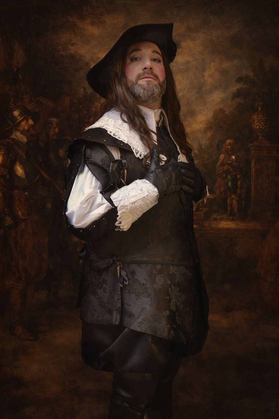 He was a man of stern bearing, dressed in black silk embroidered with shadowed flowers, his white collar sharp as frost, and gloves of dark leather that never left his hands. His beard was touched with silver, and his eyes carried the heavy light seen in the portraits of Rembrandt himself—eyes that had known both fortune and grief.